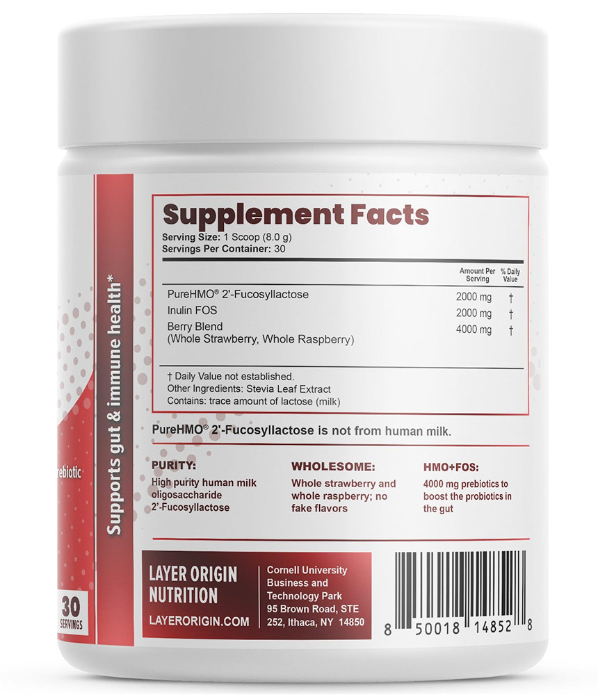 Human milk oligosaccharide (HMO) super prebiotic powder flavored with organic whole strawberry and raspberry powders. Filled with 8000 mg per scoop, amounting to 30 servings (1-month supply).