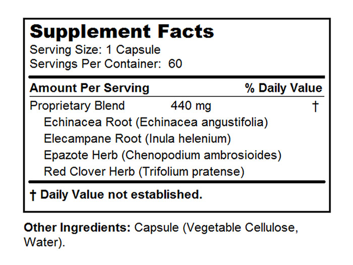 Echinacea Root (Echinacea angustifolia), Elecampane Root (Inula helenium), Epazote Herb (Chenopodium ambrosioiddes), Red Clover Herb (Trifolium pretense), Vegetarian Capsule (Vegetable Cellulose, Water).