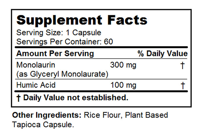 Monolaurin (as Glyceryl Monolaurate), Humic Acid, Rice Flour, Plant Based Tapioca Capsules.