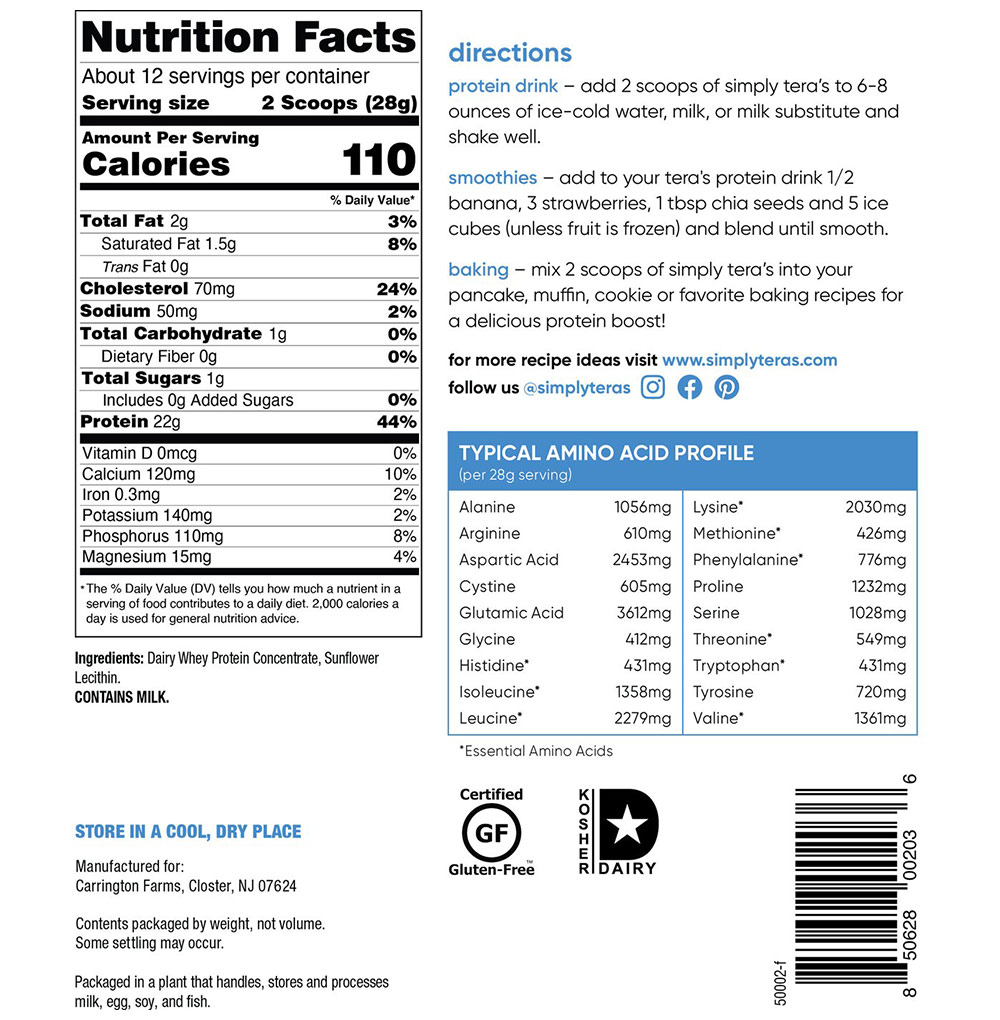 Notice: Individual results may vary. You should always consult with your physician before starting this product or any health-related program. Disclaimer: The product descriptions and the statements on this page are from manufacturers and/or distributors and have not been evaluated by VitaSprings or the FDA. These products are not intended to diagnose, treat, cure, or prevent any disease. VitaSprings does not imply any medical claims from the customer reviews on this Pure Whey Protein - Plain Unsweetened product on this website. © Simply Tera's