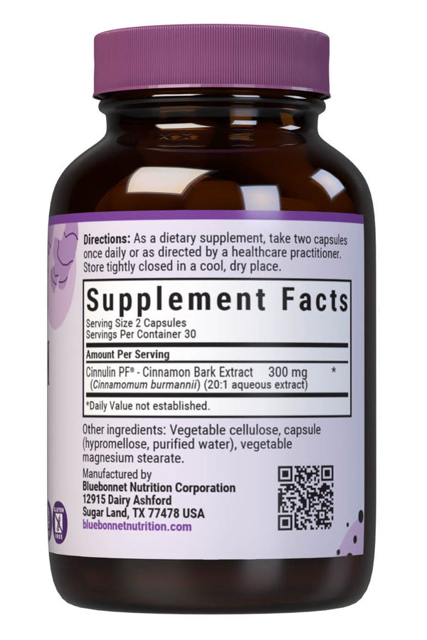 Bluebonnet's Standardized Cinnulin PF Cinnamon Bark Extract Capsules provide a standardized water-soluble extract of type A polymers, the most researched active constituents found in cinnamon bark. A clean and gentle water-based extraction method is employed to capture and preserve cinnamon's most valuable components while eliminating toxic compounds typically found in whole cinnamon and fat-soluble cinnamon extracts.