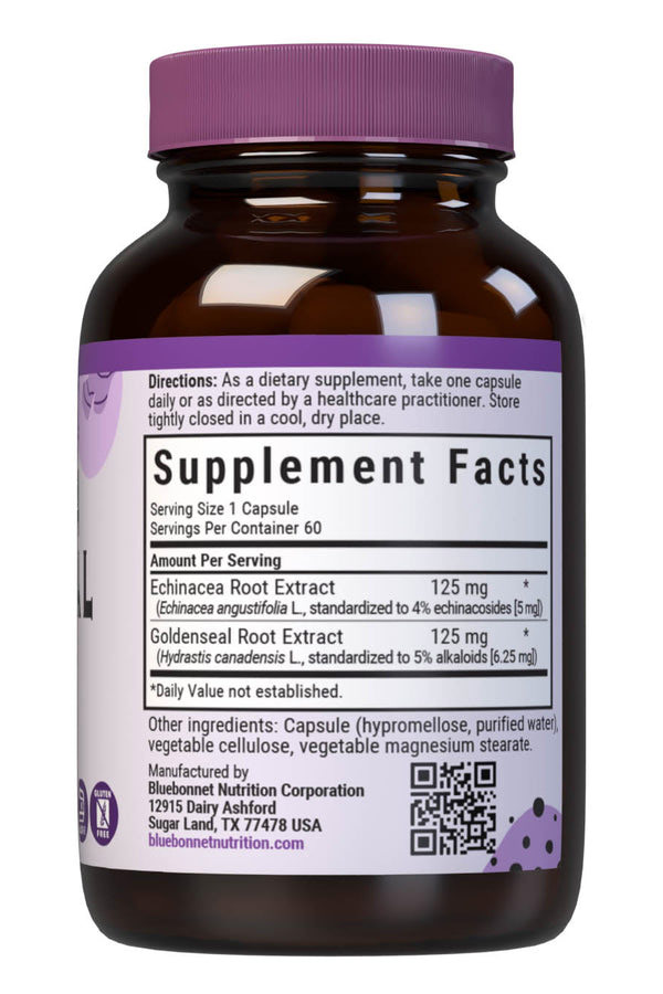 Bluebonnet's Standardized Echinacea Goldenseal Root Extract Capsules provide a standardized extract of echinacosides and alkaloids, the most researched active constituents found in echinacea and goldenseal, respectively. A clean and gentle water-based extraction method is employed to capture and preserve both echinacea and goldenseal's most valuable components.