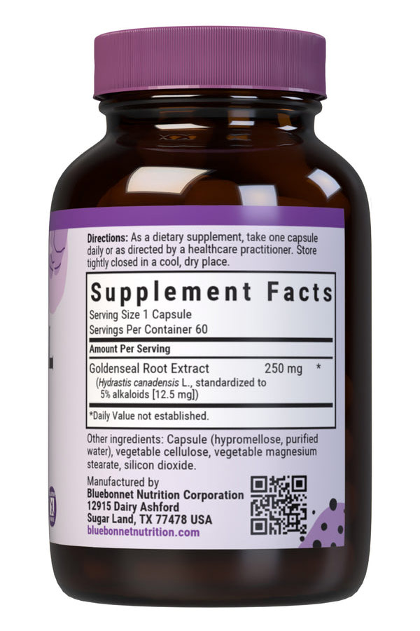 Bluebonnet's Standardized Goldenseal Root Extract Capsules provide a standardized extract of alkaloids, the most researched active constituents found in goldenseal. A clean and gentle water-based extraction method is employed to capture and preserve goldenseal's most valuable components.