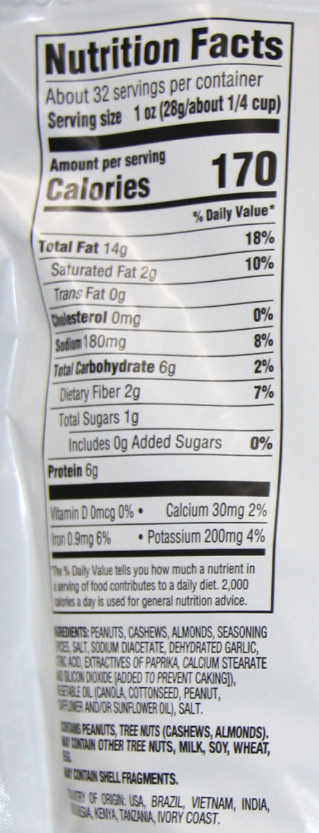 - Peanuts, Cashews & Almonds with a Tapatio Flavored Seasoning.