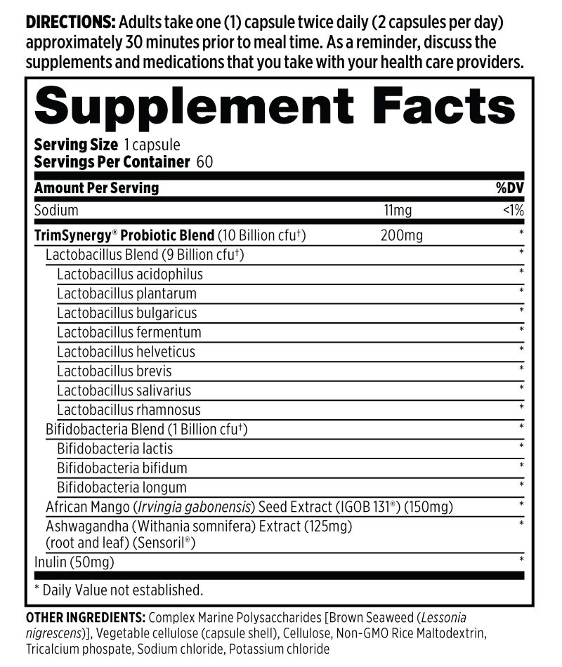 Adults can take one capsule twice daily, about 30 minutes before mealtimes. TrimSynergy Probiotic supports healthy digestion while supporting weight management goals as well as supports stress and energy levels. There's no need to refrigerate after opening, as these are shelf-stable. It's always best to collaborate with a healthcare provider when taking any supplements or medications. UPC Code: 855757003701