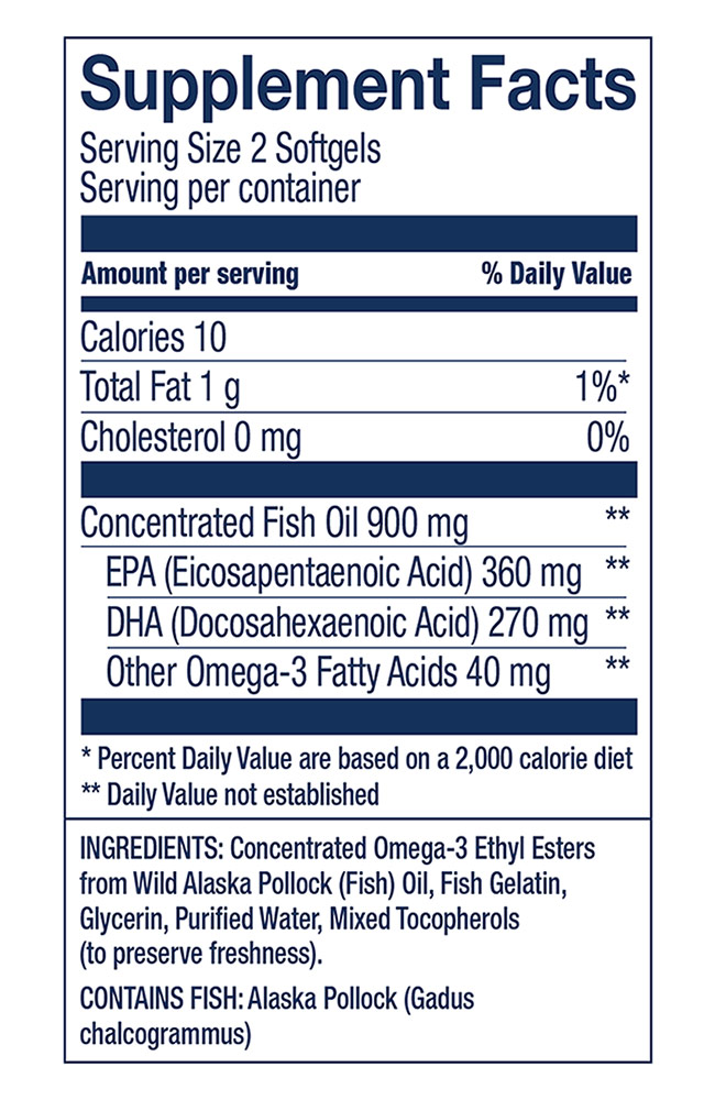 Concentrated Omega-3 Ethyl Esters from Wild Alaska Pollock (Fish) Oil, Fish Gelatin, Glycerin, Purified Water, Mixed Tocopherols (to preserve freshness).