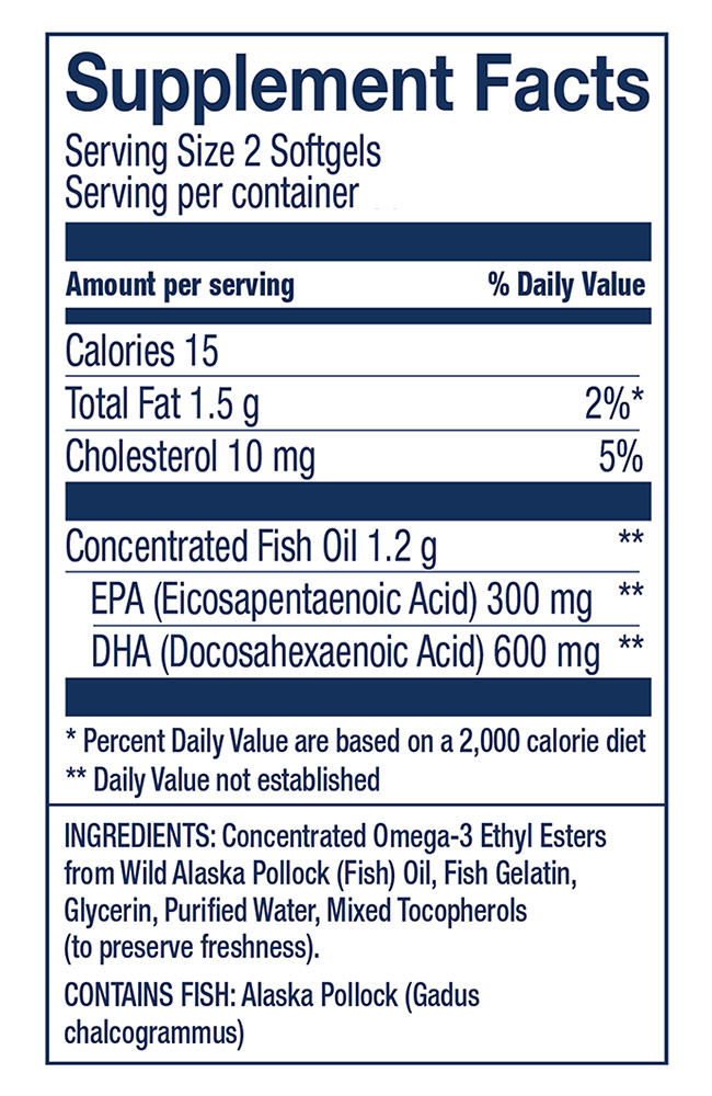 Concentrated Omega-3 Ethyl Esters from Wild Alaska Pollock (Fish) Oil, Fish Gelatin, Glycerin, Purified Water, Mixed Tocopherols (to preserve freshness).