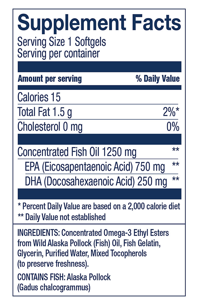 - Each softgel contains 750mg EPA, 250mg DHA for a total of 1000mg EPA + DHA.
