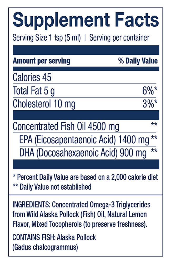 Concentrated Omega-3 Triglycerides from Wild Alaska Pollock (Fish) Oil, Natural Lemon Flavor, Mixed Tocopherols (to preserve freshness).