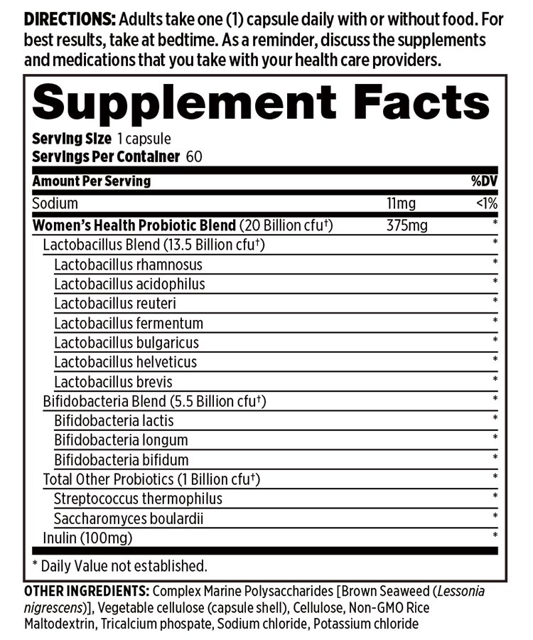 Adults can take one capsule daily with or without food to help support digestive health. For best results, take Women's Health Probiotic at bedtime. There's no need to refrigerate after opening, as our probiotics for women are shelf-stable. It's always best to collaborate with a healthcare provider when taking any supplements or medications. UPC Code: 855757003510