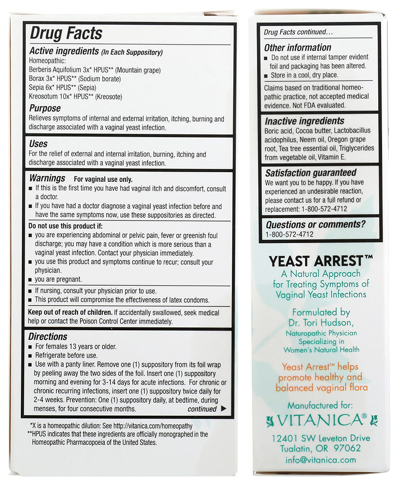 A natural approach for treating vaginal yeast infections, Yeast Arrest is unlike any other natural suppository utilizing a unique homeopathic formula for the effective treatment of external and internal irritation, itching, burning and discharge associated with a vaginal yeast infection. This product should be used after a health care provider has diagnosed a vaginal yeast infection.
