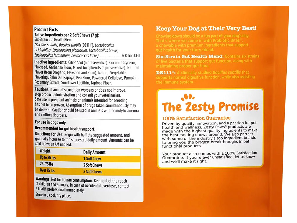 Each soft chew contains six strains of probiotics, two sources of enzymes plus pumpkin and papaya to aid in healthy digestion and promote a strong immune system. Probiotic Bites may provide relief from occasional gastric distress, including constipation, indigestion, gas, and bloating.